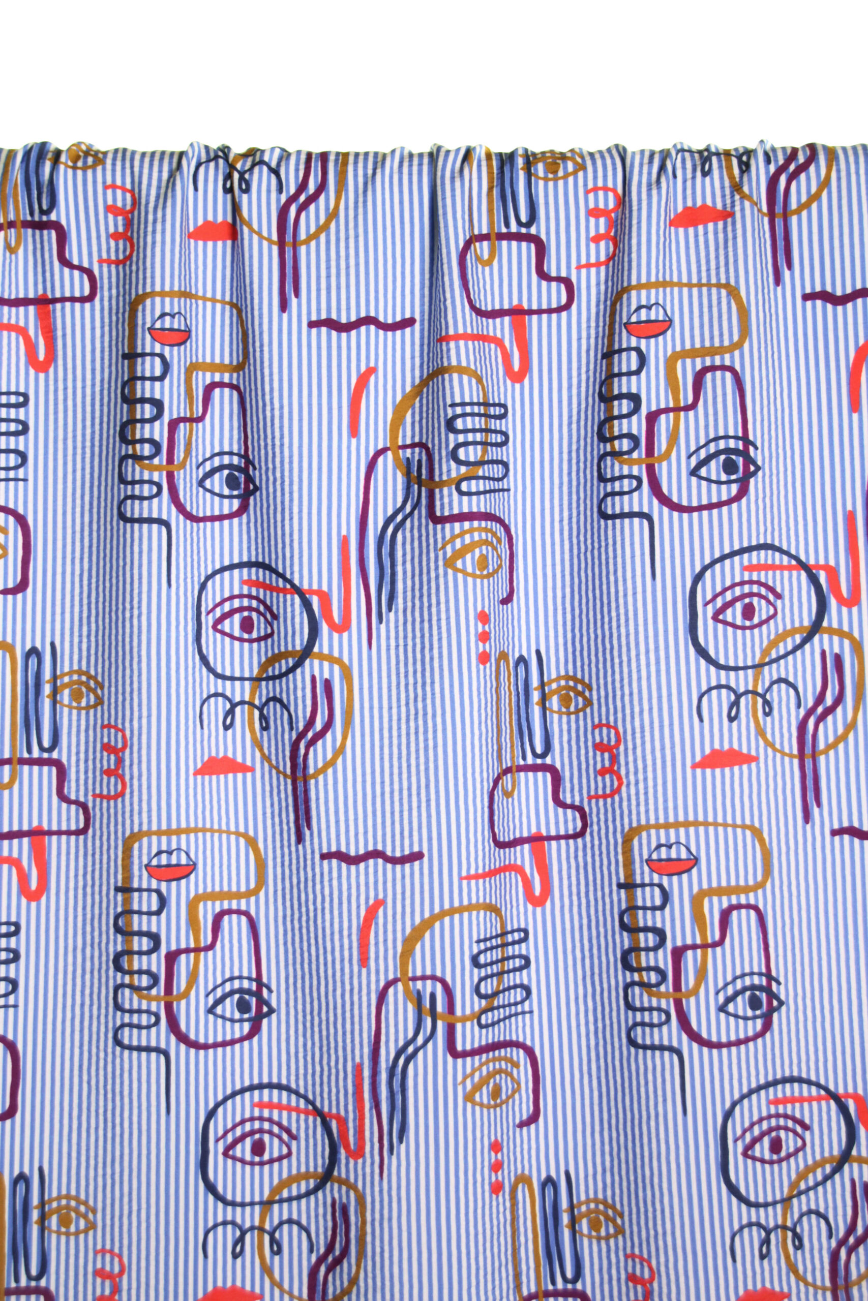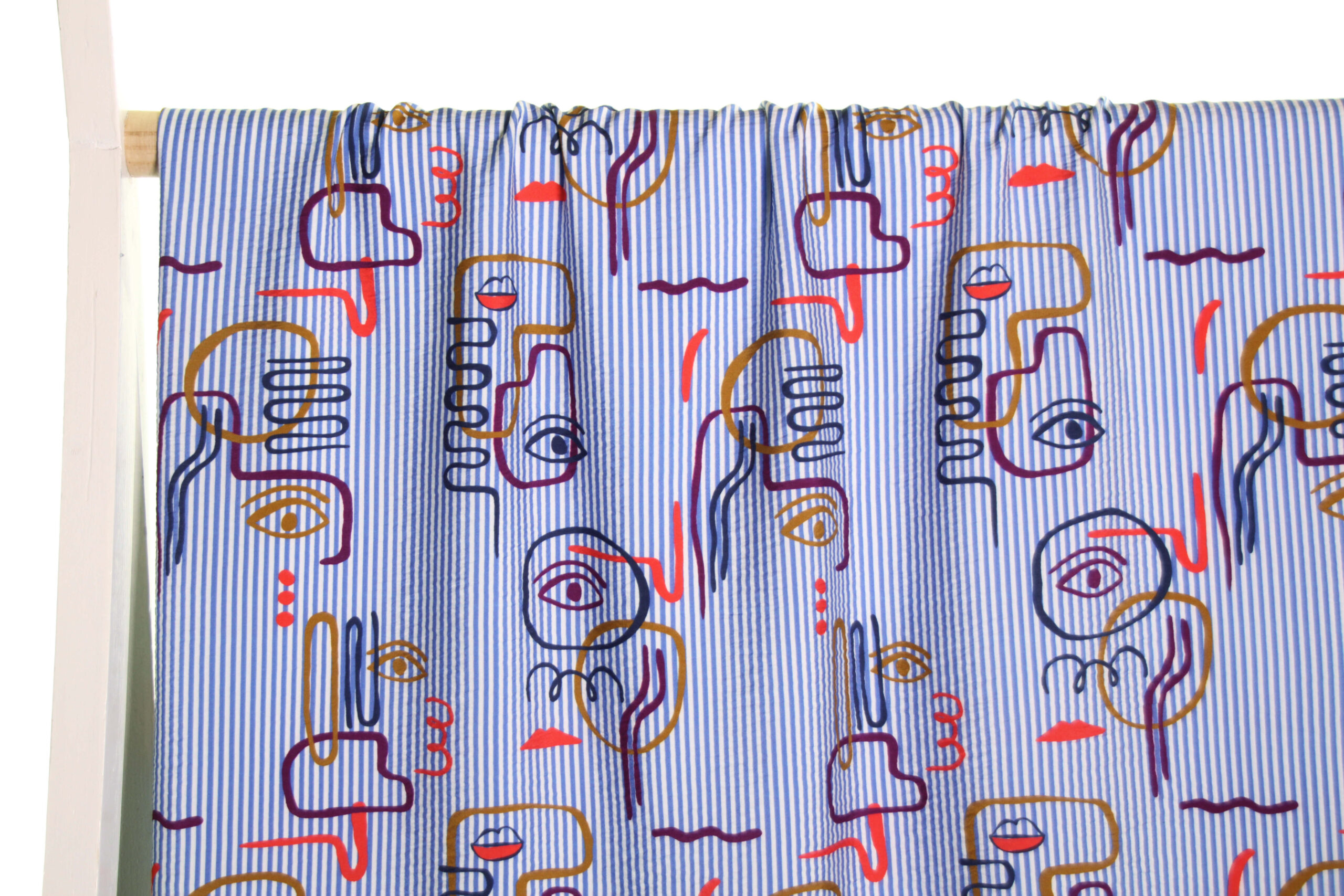 Een viscose/polyamide mix met lichte textuur, die wat ‘gebobbeld’ lijkt en een subtiele satijnglans. De stof heeft wit en blauwe lijntjes met daarop een grafische print van ogen en gezichtjes. Deze stof is geschikt voor blouses, jurken, rokken,…