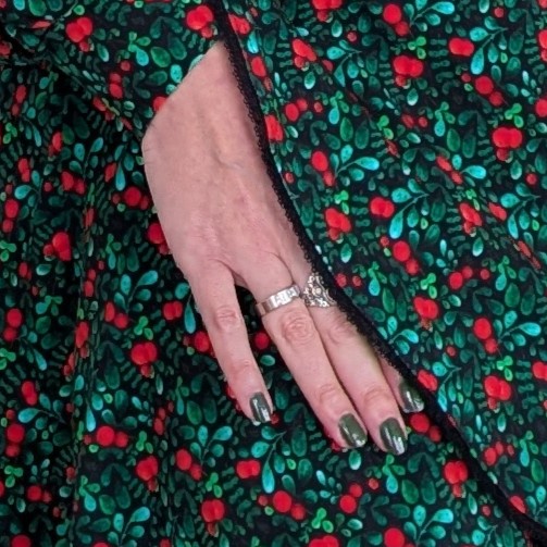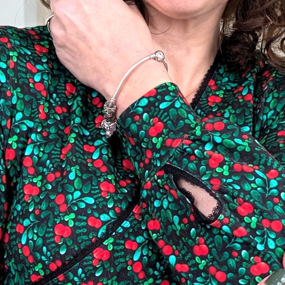De overslag zorgt ook voor een V-hals wat weer een mooi decolleté geeft. De rok heeft ook een overslag en loopt wijder uit, als een klokrok. De bisschopsmouwen maken het plaatje helemaal af en hebben een mooi kanten detail bij de pols.