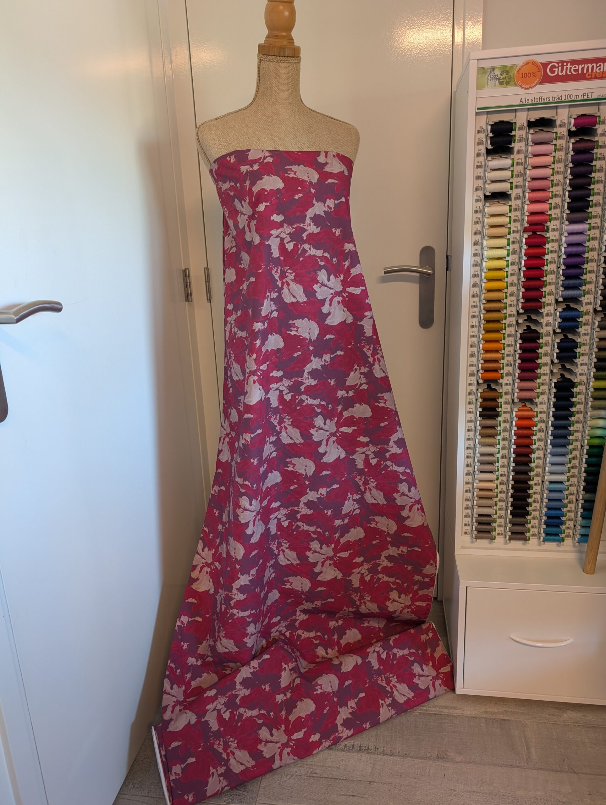 Een mooie poplin met een abstracte print die aan bloemen doet denken