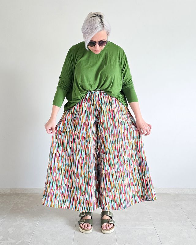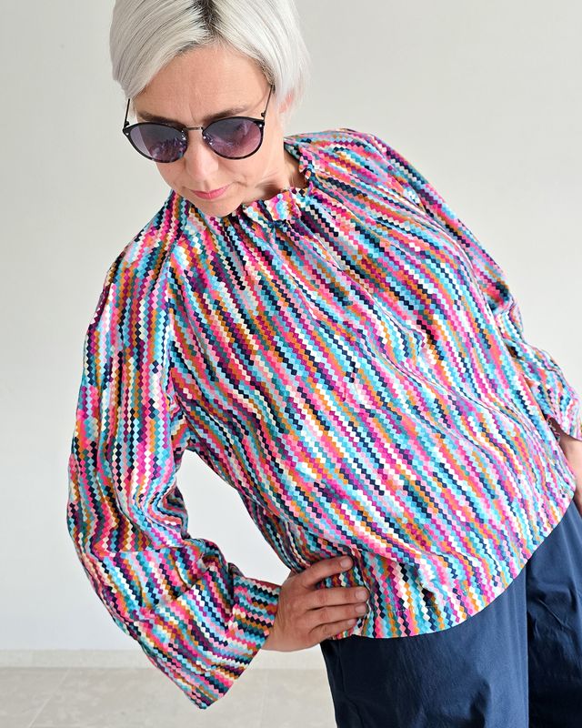 Dit is de stof met blauwe, petrol en roze blokjes.